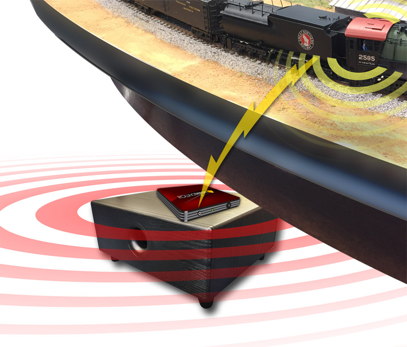 Как это работает? Динамики в большинстве тепловозов N-масштаба воспроизводят звуки только с частотой выше примерно 600 Гц. Человеческое ухо может слышать звуки от 20 до 20000 Герц, а чувствовать звуки мы можем на еще более низких частотах. Многие звуки, которые издают настоящие поезда, имеют низкие частоты, которые модели не могут воспроизвести. Это связано с крошечными динамиками, которые не могут перемещать достаточно воздуха. Чтобы преодолеть этот недостаток, Paragon3 включает в себя ультрасовременную систему радиопередатчика Rolling Thunder, которая отправляет низкочастотные звуки на специально разработанный ресивер и сабвуфер в соответствии с Вашим макетом. Поскольку низкочастотные звуки имеют большую длину волны, человеческому уху трудно определить направление источника. В результате, когда локомотив перемещается по путям, Вы можете слышать высокочастотные звуки, исходящие от локомотива, и низкочастотные звуки от сабвуфера - все они идеально синхронизированы с движением локомотива и струей дыма, и Ваши уши будут воспринимать все звуки, исходящие от модели!