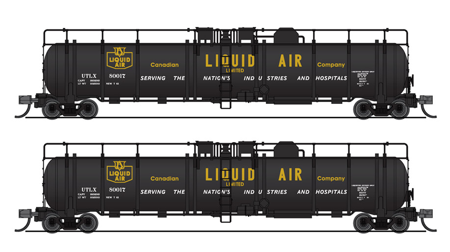 Набор из двух четырехосных железнодорожных цистерн повышенной емкости для транспортировки и хранения жидких криогенных продуктов: кислорода, азота или аргона. Принадлежность Canadian Liquid Air Co.