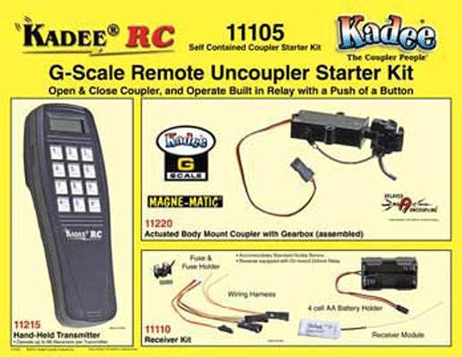 Базовый стартовый комплект - дистанционно управляемая система для расцепления вагонов. Предназначена для использования с локомотивами, товарными и пассажирскими вагонами. Набор включает в себя все необходимые компоненты для преобразования одной сцепки одного вагона/локомотива в дистанционно управляемую: сцепка KADEE 11220 со встроенным сервоприводом, дистанционный пульт управления KADEE 11215, приемник сигнала пульта ДУ KADEE 11110