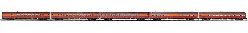 Пассажирский пятивагонный состав SP Daylight. Модель для трёхрельсовой системы Marklin. Принадлежность Southern Pacific