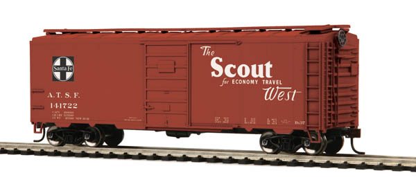 Серия “Ready-to-Rail”, стандартный пульмановский 40' товарный вагон типа PS-1, принадлежность Santa Fe. Минимально рекомендованный радиус - 18 дюймов (457,2 мм).