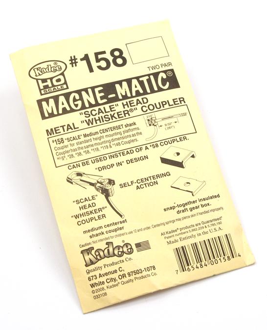 Kadee # 158. Самоцентрирующиеся металлические кулачковые сцепки Whisker (с центрирующими пружинными усиками на хвостовике сцепки), серия Magne-matic, комплект для сборки (KIT). В комплекте 2 пары (4 шт). По размеру аналогичны сцепкам Kadee №№5, 28, 38, 58, 118, 119 и 148.